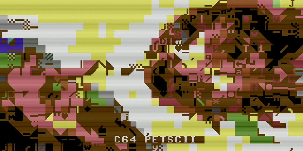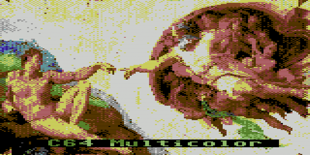 A Blender (.blend) file containing 8 node groups (one for each graphic mode / algorithm), a "Text Layer" node group, sample bitmap character sets (for use in PETSCII mode or text layers), custom C64 and ZX Spectrum color palettes, 2 sample images, sample demo screens, a scanlines/CRT shader, a basic compositor setup and Python code to export files that display images on original 8-bit hardware (or emulators)